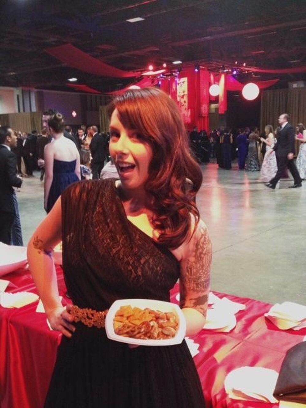 Veterans Affairs blogger Kate Hoit shows off her "fancy" pretzels and cheese crackers at the official inaugural ball Monday night.
